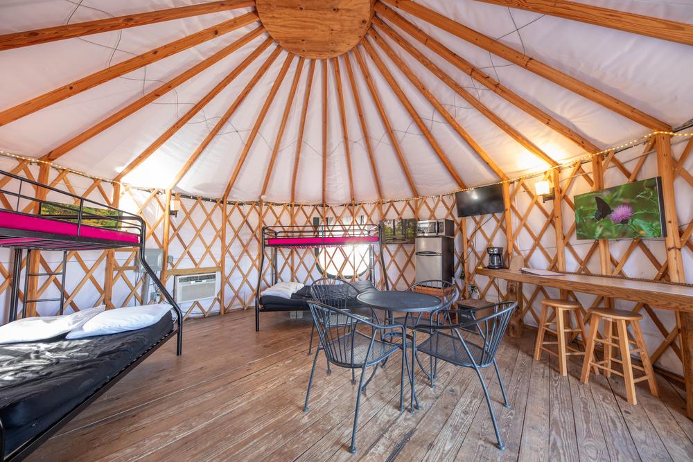 The Longhorn Loop yurt includes a foldout futon, large picnic shelter and doorstep lake access, while the ADA compliant Hummingbird Beach yurt comes with two full-sized futon bunk beds with nearby beach access. The Longhorn Loop Honeymoon yurt has a queen-sized log canopy bed indoors and two picnic tables, a grill, a fire pit and a lantern holder outdoors. Although there is no running water in the yurts, restroom facilities are located within 50 yards of the Longhorn Loop and Hummingbird Beach yurts, and 1000 yards from the Longhorn Loop Honeymoon yurt. Pets are not allowed inside yurts.